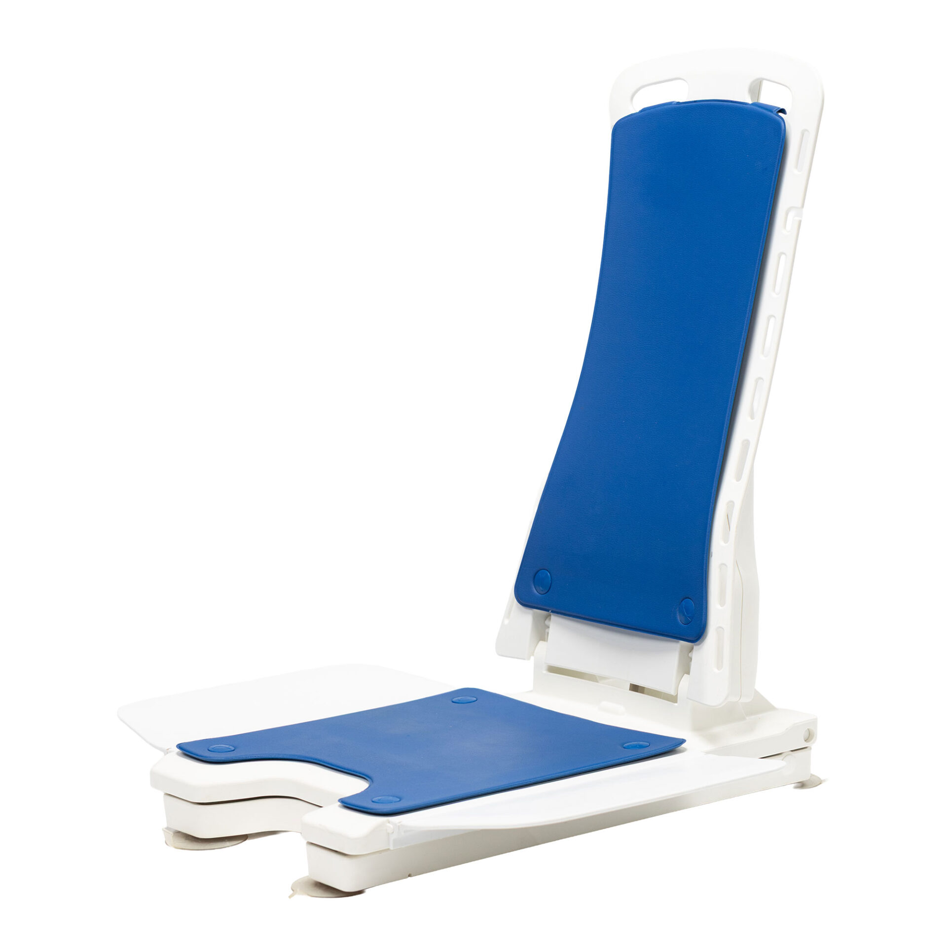 The lift features a padded seat and backrest for enhanced comfort, with the backrest reclining up to 50 degrees to accommodate relaxed positioning. A waterproof, floating hand control with a lithium-ion battery enables smooth, quiet operation at the touch of a button. The two-piece design allows for easy assembly, disassembly, and transport, while four suction cups provide secure anchoring to the tub base.