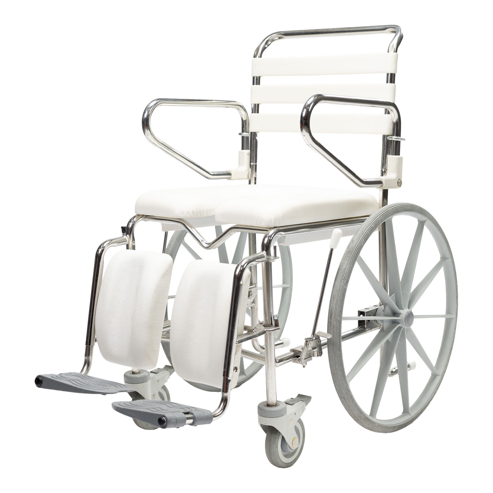 The KCare Self-Propelled Shower Commode with 18″ wheels, features swing-up arms, adjustable footrests, and a durable stainless steel frame.